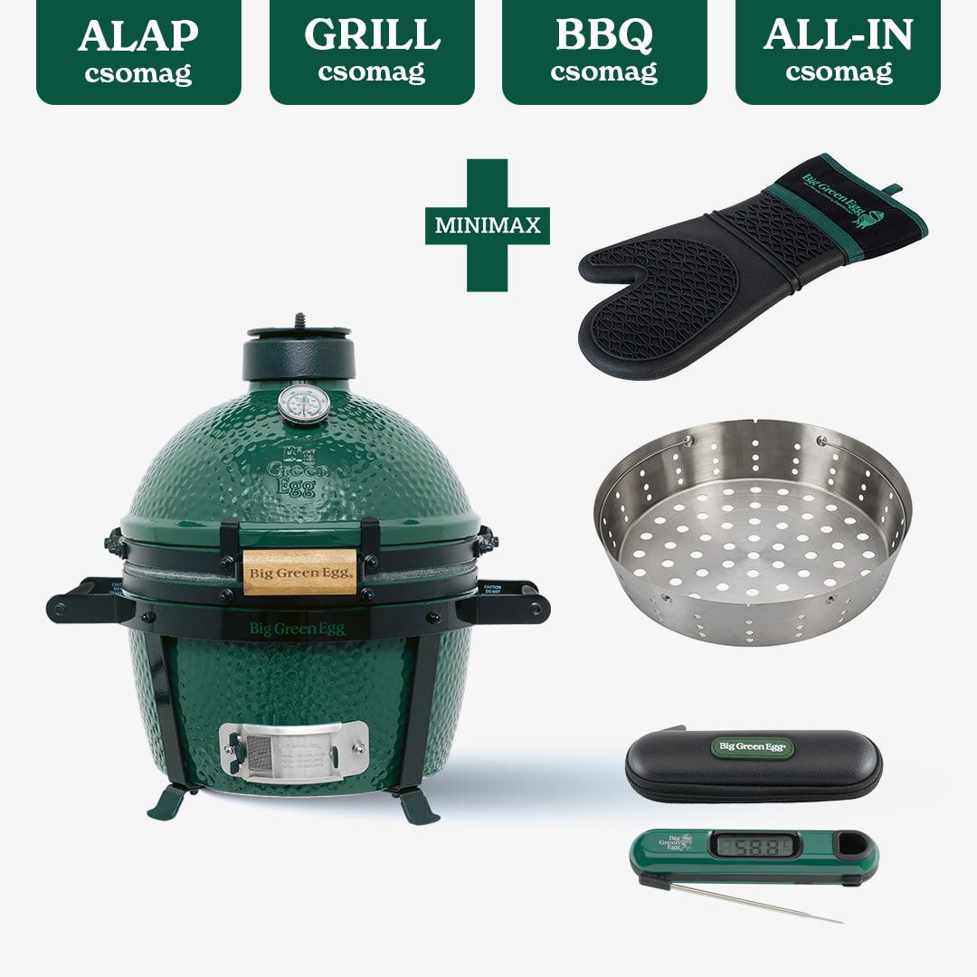 A MiniMax ALL-IN PLUSZ csomagokban egy profi maghőmérőt, szilikonos hőálló kesztyűt, tisztítást könnyítő faszéntartó kosarat találsz pluszban az eddigieken felül. Vigyél mindent egy csomagban, és élvezd ki a Big Green Egg határtalan lehetőségeit!